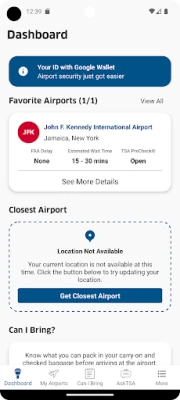 + Quickly search which items you can bring with you through the checkpoint onto the airplane. + Request live assistance from TSA through the AskTSA social media integration. + Check how historically busy the airport will be on your specific day and time of travel. + Check crowd-sourced TSA security checkpoints wait times at the airport of your choice. + Add your own TSA security checkpoints wait time for others to see (NOTE: You must be at the airport in order to report wait times). + Check the delay information and current weather conditions at your favorite airports nationwide. + Consult the TSA Guide on how to prepare for and get through the security checkpoint quickly. + Discover which airports and airlines support TSA PreCheck®, and learn how to sign-up.