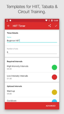 Seconds comes with templates for High Intensity Interval Training (HIIT), Tabata and Circuit Training making it very easy to quickly create a timer for your workouts. If you require more advanced options, Seconds Interval Timer doesn't let you down. You can create completely custom timers one interval at a time, or even combine timers together to create compound timers.