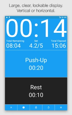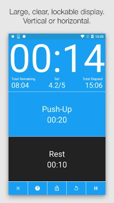 The timing screen has a large, clear, time display that can easily be read from a distance. It works in portrait or landscape. The current interval and next interval are displayed so you can see also what's up now and next. The entire background uses the current interval colour so you don't even need to read the name.